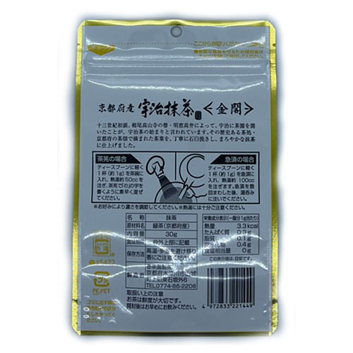 京都府産の抹茶の原料のてん茶を石臼で挽いて丁寧に仕上げた風味豊かな宇治抹茶を配合しています。 茶道でも使用している本物の抹茶です。 容量:30g